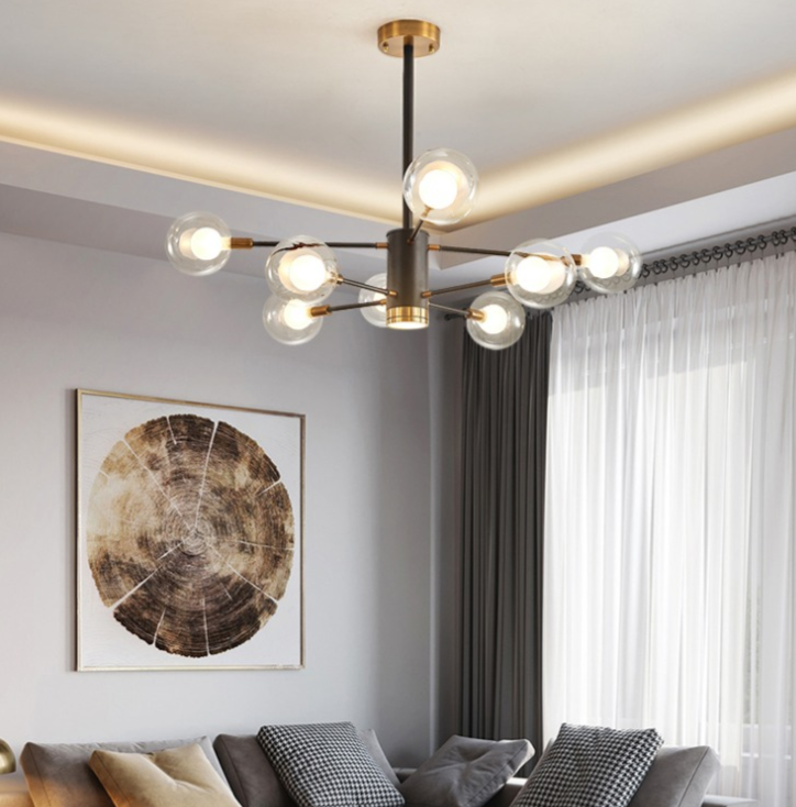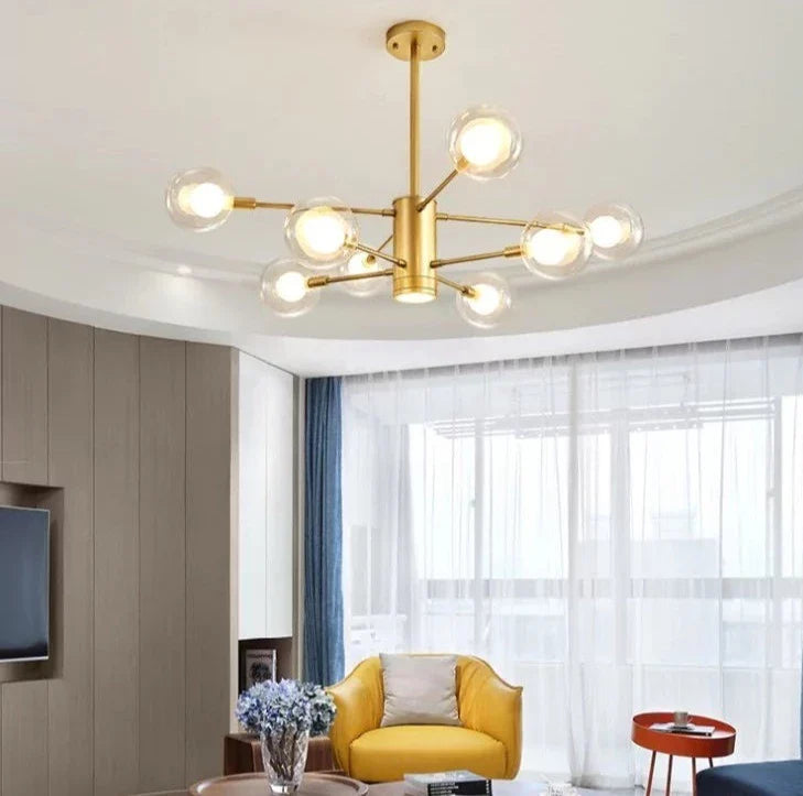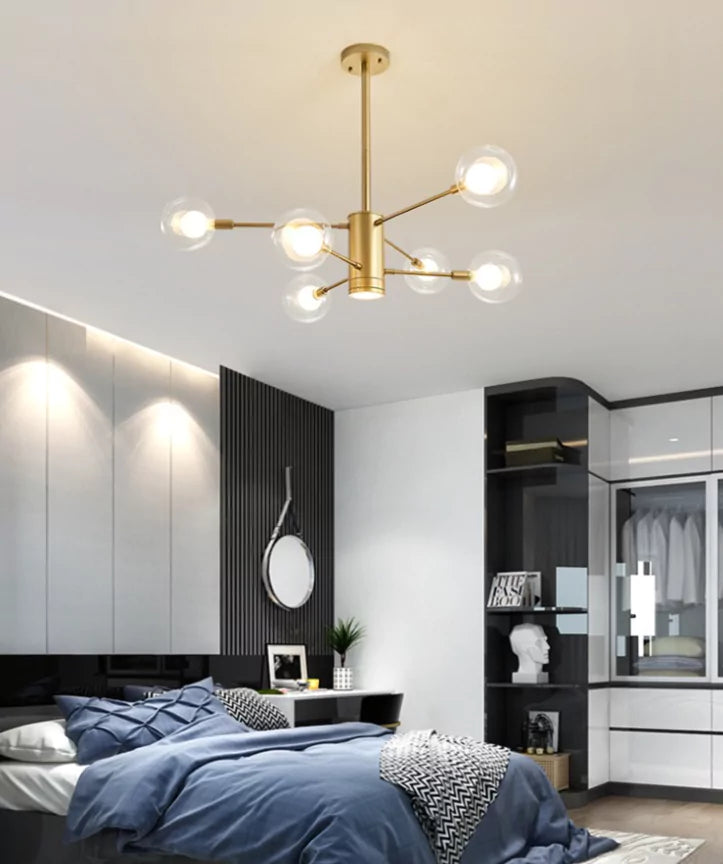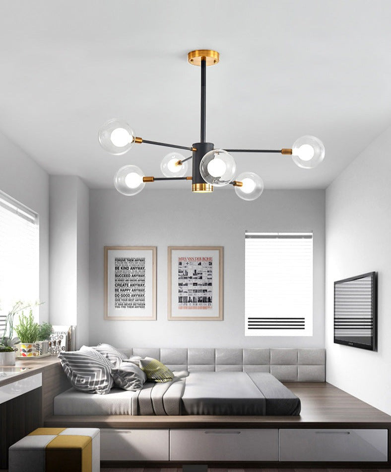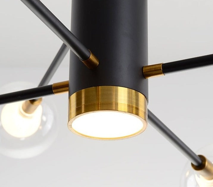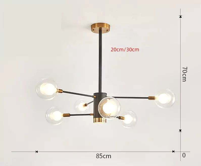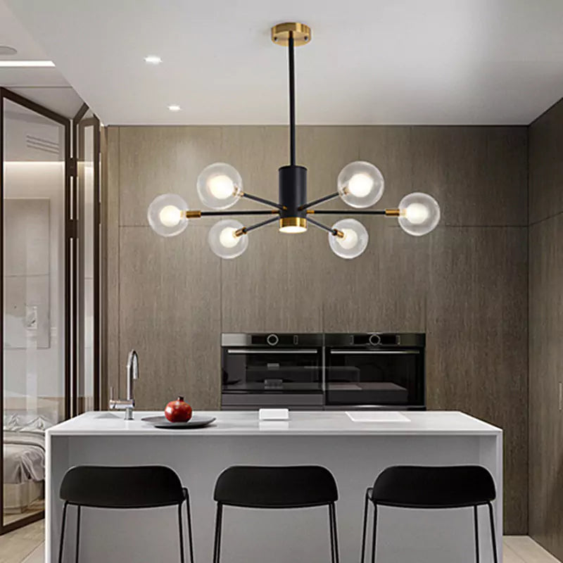 Lustre contemporain à 6 boules en verre au style minimal, avec finitions dorées et noires.